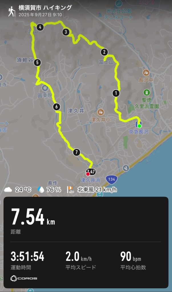 ルートは「京急長沢駅」から登り始めて、「京急津久井浜駅」まで下るシンプルなコース。