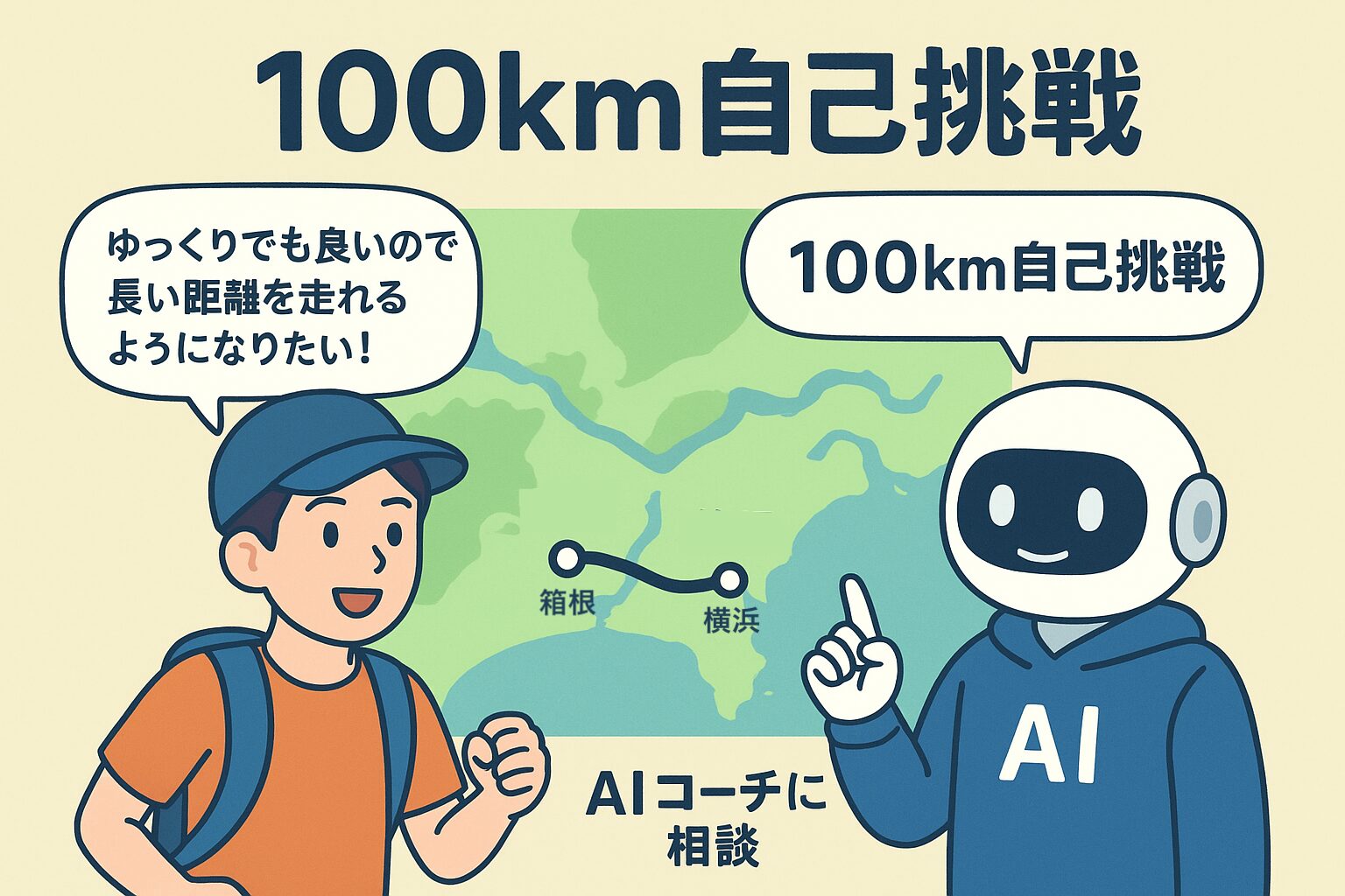 昨日、50kmほど走ったり歩いたりしてきました。でも100kmは到底無理と思って、試しにAIコーチに相談してみたら、なかなか良い回答をもらえました。